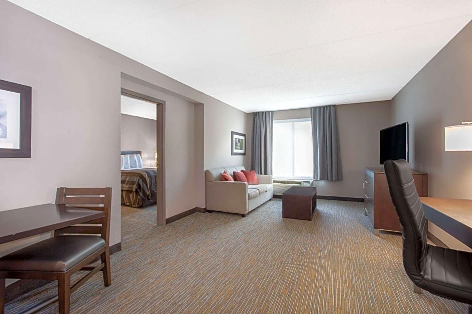 This suite features a 32-inch flat-screen cable TV, microwave, and small refrigerator. A seating area with a sofa bed is also included.