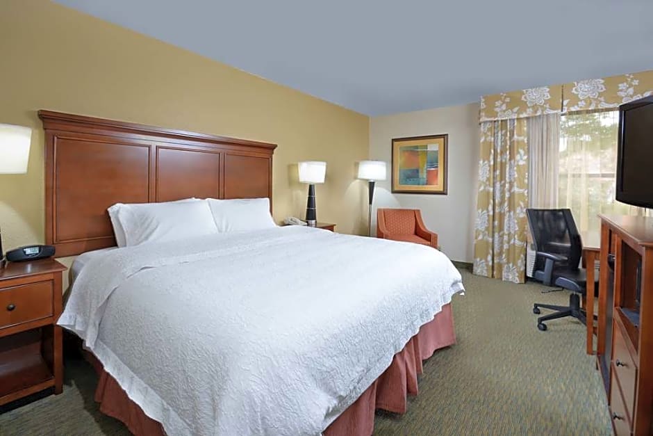 The Hampton Inn Raleigh/Durham Airport offers a variety of room types. These include a King Room with disability access/non-smoking and a tub, a Double Queen Room that is non-smoking, and a King Room that is non-smoking. The rooms accommodate different numbers of adults and children and have either a King size bed or two Double beds. Smoking is not allowed in any of the rooms.