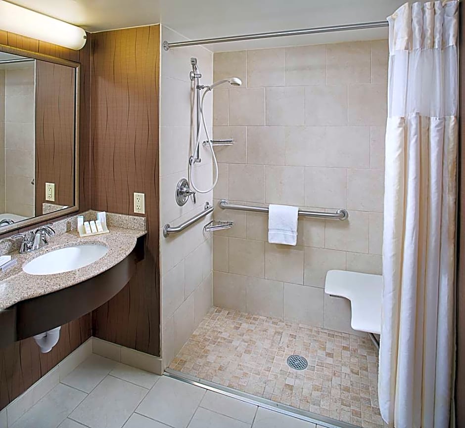 This mobility accessible standard room features one king-sized bed, and an accessible tub. This room offers the latest in technology and ergonomic comfort to our guests. Grab bar in tub with attached accessible seating, lowered vanity in bathroom, and lowered shelf in closet. The ergonomic Mirra chair by Herman Miller is good for your back and better for work. Enjoy an in-room movie or your favorite television show on our 36-inch HDTV. There is also a microwave, refrigerator and coffee and tea maker to help you feel at home. And for conducting business, our rooms ensure your productivity thanks to the spacious work desk, two telephones with dataport and voicemail and complimentary WiFi access. Any corresponding photo may not reflect the specific accessible room type or room feature.