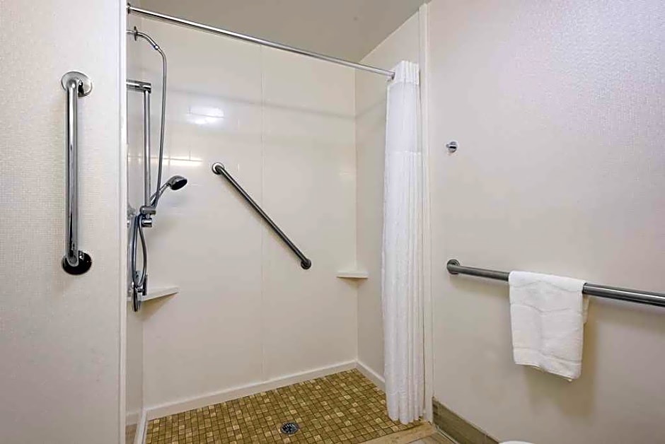 This mobility and hearing accessible, non-smoking room features one king-sized bed, and an accessible roll-in shower. The room also has a visual alarm and notification devices for the doorbell or door knock and incoming phone calls. The room features comfortable soft seating, microwave, refrigerator, a HDTV, and easy to operate alarm clock/radio. The free WiFi will help you stay connected while on the road. If you prefer not to work at the desk, you can use the convenient lapdesk instead. You'll also enjoy the convenience of having a coffeemaker with tea service and iron/ironing board in your room. Any corresponding photo may not reflect the specific accessible room type or room feature.