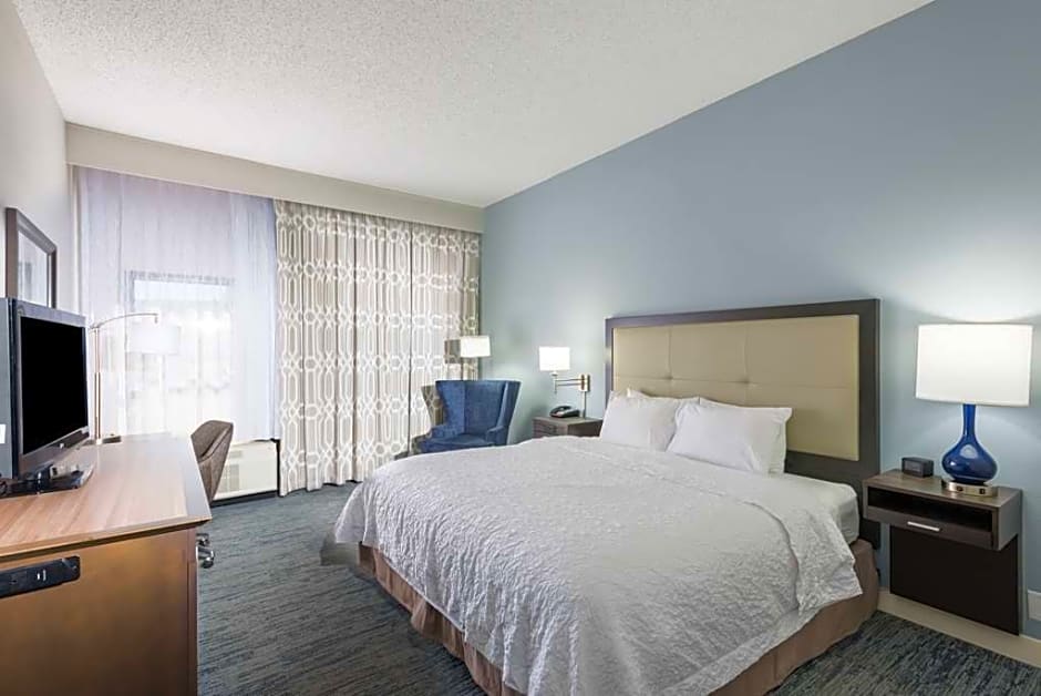HDTV, free WiFi access, soft seating, work desk & chair, mini-refrigerator, microwave Settle into this spacious non-smoking room which features one king-sized clean and fresh Hampton bed® and a comfortable soft seating area. Relax in front of the HDTV or catch up on work at the desk and stay connected with free WiFi access. Enjoy the convenience of having a mini-refrigerator, microwave and a coffeemaker in your room. The bathroom provides fluffy towels, a shower with WaterPik showerhead and a curved shower rod to allow more light and space in the shower.