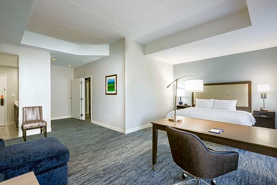 Free WiFi, whirlpool tub, sofa bed, 32-inch HDTV, wet bar, refrigerator, microwave, desk Enjoy this spacious non-smoking studio suite which features one king-sized clean and fresh Hampton bed®, a queen-sized sofa bed and a luxury whirlpool tub. Relax in front of the 32-inch LCD TV or work at the desk with ergonomic chair and stay connected with free WiFi access. This suite also provides a convenient wet bar, a refrigerator, a microwave and coffeemaker. Refresh yourself in the stylish bathroom which offers fluffy towels and a walk-in shower with a rain showerhead.