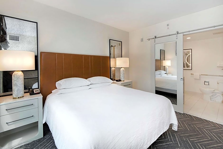 This mobility accessible standard suite features one king-sized bed, and a roll-in shower. Any corresponding photo may not reflect the specific accessible room type or room feature.