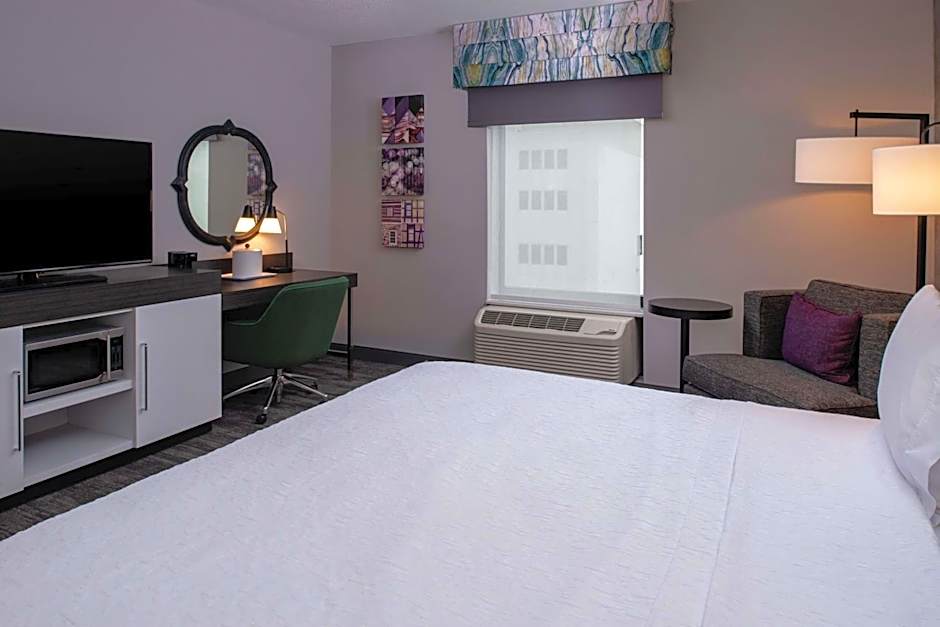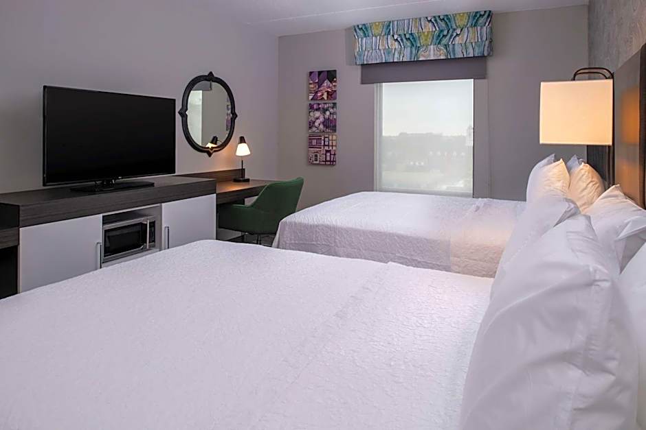 The Hampton Inn & Suites Winston-Salem Downtown offers a variety of rooms including Queen Room with Bath Tub - Mobility Accessible/Non-Smoking, Queen Studio Suite with Two Queen Beds - Non-Smoking, King Room, King Room with Roll in Shower - Mobility Accessible/Non-Smoking, King Studio Suite - Non Smoking, and Queen Room with Two Queen Beds. Rooms range from doubles to quadruples in occupancy and have either queen or king size beds. All rooms are non-smoking.