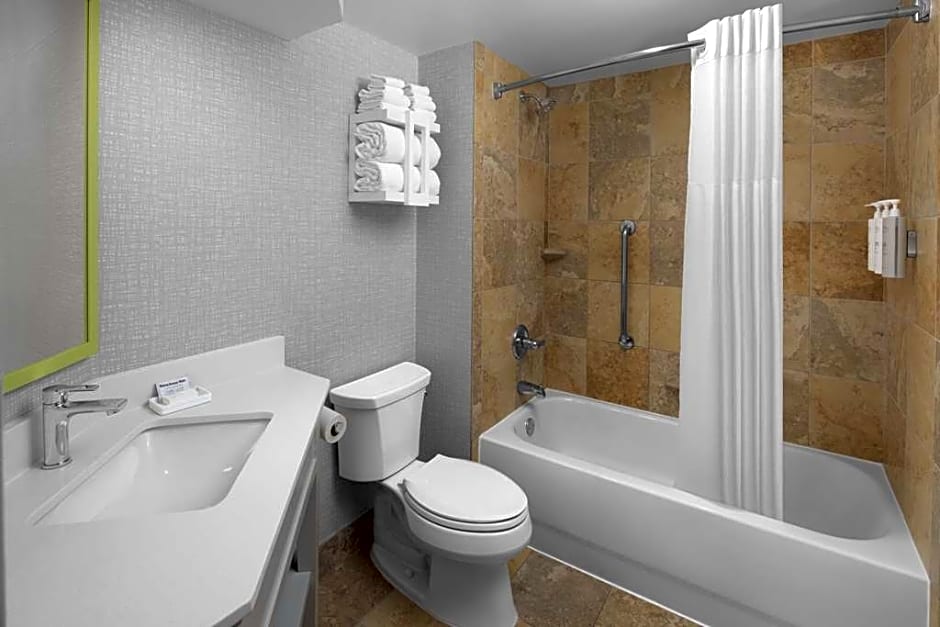 This mobility and hearing accessible, non-smoking room features a separate sleeping and living room and an accessible bathtub. This room also has a visual alarm and notification devices for the doorbell or door knock and incoming phone calls. Rest and relax with two queen-size clean and fresh Hampton beds® and a 37-inch TV, plus an easy to operate alarm clock/radio in the sleeping area. In the living room, you'll find a sofa bed and sitting area, mini-fridge, microwave, and a second 37-inch TV. Catch up on work at the large desk, or surf the web with free WiFi access. You'll also enjoy the convenience of having a coffeemaker and iron/ironing board in your room. Any corresponding photo may not reflect the specific accessible room type or room feature.