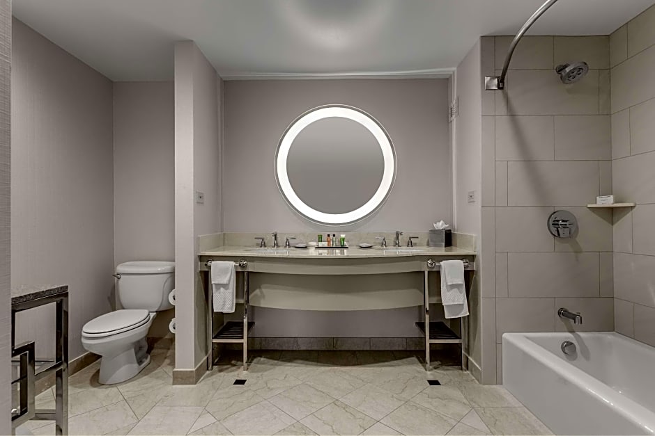 This mobility accessible executive level room features one king-sized bed and an accessible tub. In addition to all the comforts of our traditional rooms, guests who choose these king-sized bed rooms on our Executive Level will enjoy our Private key access Concierge Floor. When you return from a long day at the office or shopping, your bed will be turned down and waiting for you, simply wrap yourself in one of our luxurious bathrobes and enjoy your evening. Any corresponding photo may not reflect the specific accessible room type or room feature.