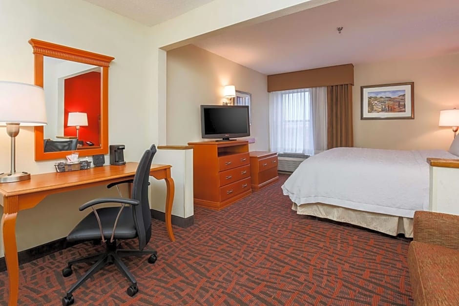 Easy chair with ottoman, 37-inch HDTV, work space, coffeemaker, free WiFi access This smaller bedroom, larger bathroom guest room offers one queen-sized clean and fresh Hampton bed®. Enjoy a comfortable easy chair with ottoman and a 37-inch HDTV. Refresh in the bathroom with a WaterPik showerhead and fluffy towels. The curved shower rod provides extra space and light when showering. Work in comfort at the large desk and stay connected with free WiFi access. Additional amenities include a handy coffee/tea maker.