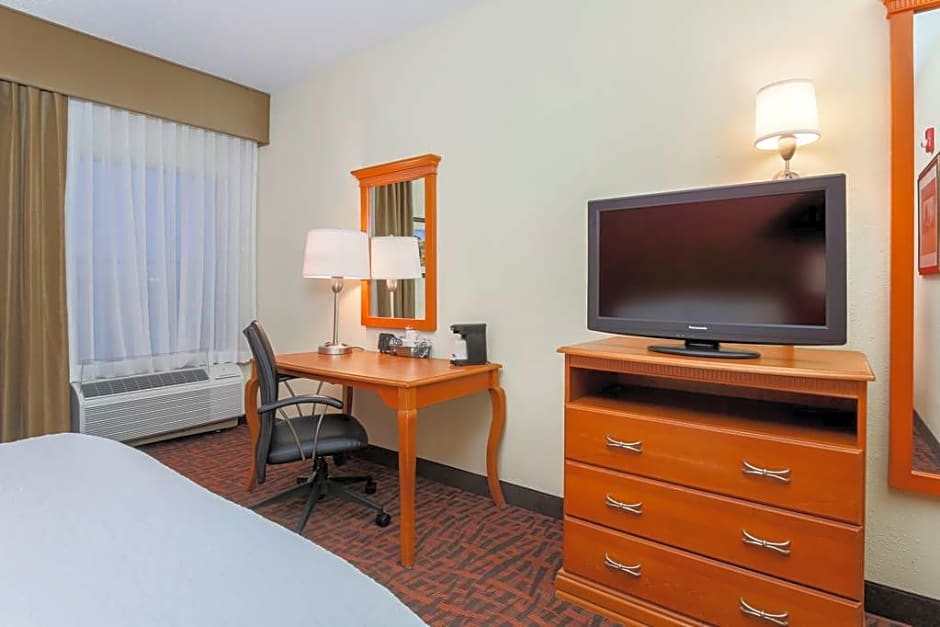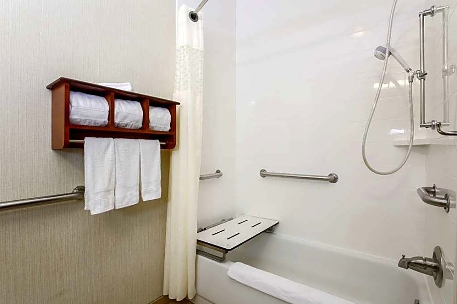 This mobility accessible, non-smoking room features one king-sized bed, and an accessible bath tub. The room features comfortable soft seating, a HDTV, and easy to operate alarm clock/radio. The free WiFi will help you stay connected while on the road. If you prefer not to work at the desk, you can use the convenient lapdesk instead. You'll also enjoy the convenience of having a coffeemaker with tea service and iron/ironing board in your room. Any corresponding photo may not reflect the specific accessible room type or room feature.