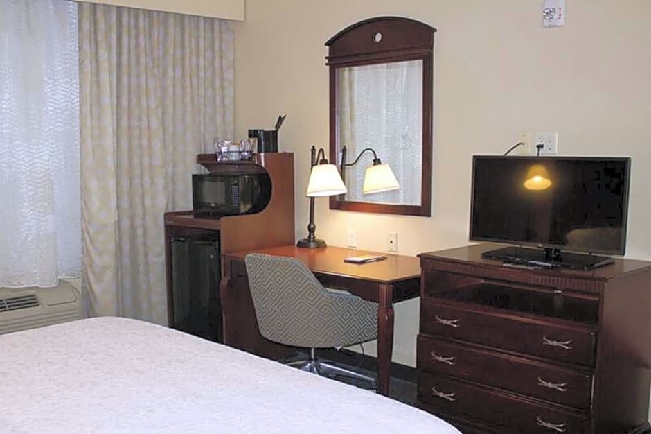 Free WiFi, 32-inch HDTV, easy chair with ottoman, work desk, coffeemaker, shower Unwind in this spacious non-smoking guest room which features our clean and fresh Hampton king bed®, a comfortable easy chair with ottoman, and a 32-inch HDTV. Catch up on work at the large desk, or surf the web with free WiFi access. Refresh in the bathroom which has a WaterPik showerhead and curved shower rod that allows more light and space in the shower.