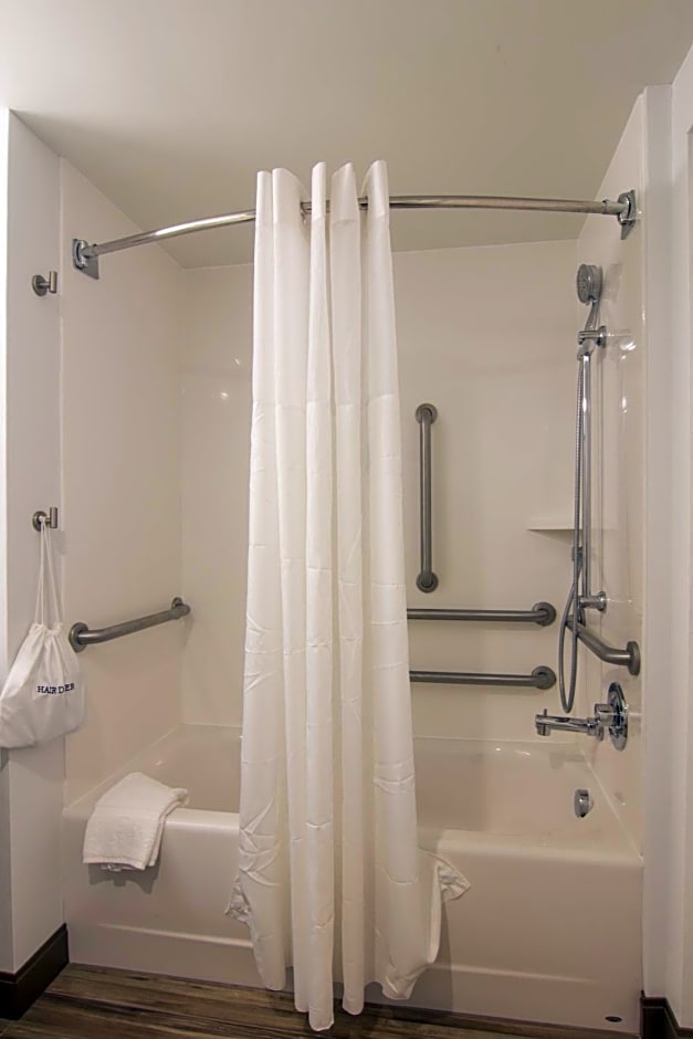 This hearing accessible, non-smoking room features one king-sized bed. The room also has a visual alarm and notification devices for the doorbell or door knock and incoming phone calls. The room features our luxurious clean and fresh Hampton bed, comfortable sofabed, microwave, refrigerator, a HDTV, and easy to operate alarm clock/radio. In the bath you will enjoy a WaterPik shower head and curved shower rod. The free Wi-Fi access will help you stay connected while on the road. If you prefer not to work at the desk, you can use the convenient lapdesk instead. You'll also enjoy the convenience of having a coffeemaker with tea service and iron/ironing board in your room. Any corresponding photo may not reflect the specific accessible room type or room feature.