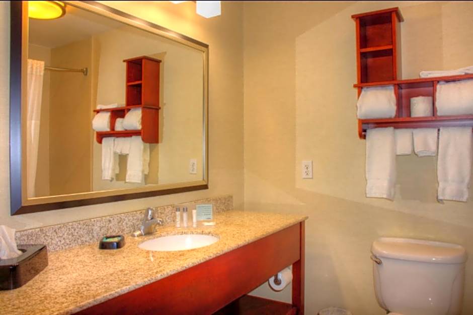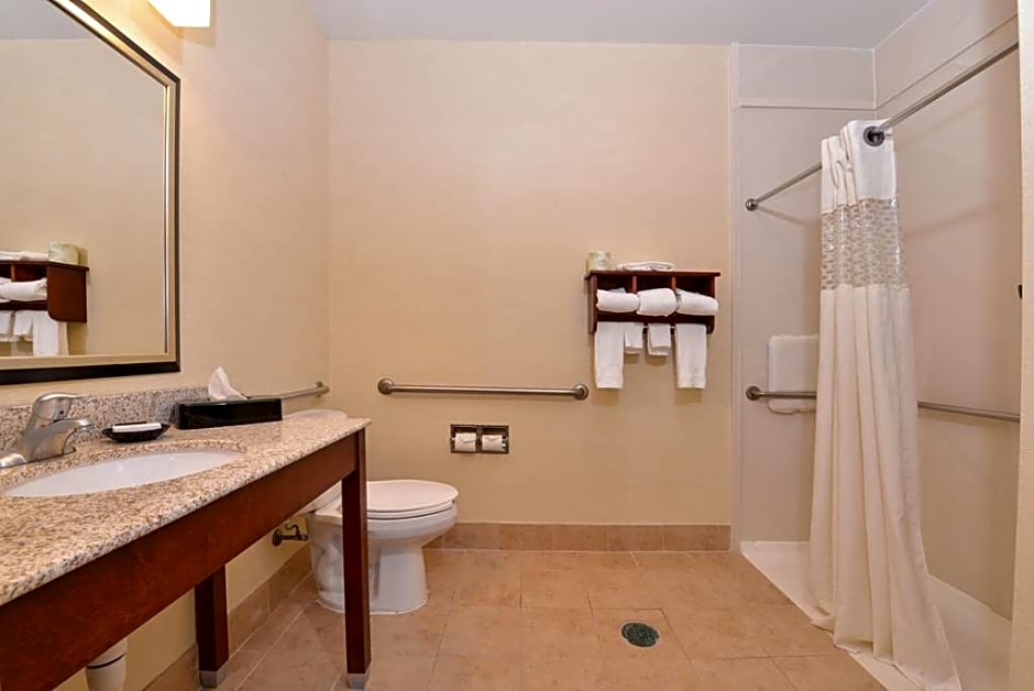 This mobility accessible, non-smoking room features one king-sized bed, and an accessible roll-in-shower. The room features comfortable soft seating, a HDTV, and easy to operate alarm clock/radio. The free WiFi access will help you stay connected while on the road. If you prefer not to work at the desk, you can use the convenient lap desk instead. You'll also enjoy the convenience of having a coffeemaker with tea service and iron/ironing board in your room. Any corresponding photo may not reflect the specific accessible room type or room feature.