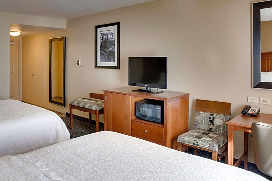 Any corresponding photo may not reflect the specific accessible room type or room feature. This hearing accessible, nonsmoking room features two queen sized beds. The room also has a visual alarm and notification devices for the doorbell or door knock and incoming phone calls. The room features our luxurious clean and fresh Hampton bed, comfortable soft seating, microwave, refrigerator, an HDTV and easy to operate alarm clock/radio. In the bath, you will enjoy a WaterPik shower head and curved shower rod. The free high-speed internet access will help you stay connected while on the road. If you prefer not to work at the desk, you can use the convenient lapdesk instead. You'll also enjoy the convenience of having a coffee maker with tea service as well as an iron with ironing board in your room.