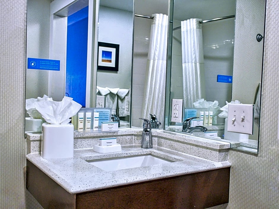 Whirlpool tub, 42-inch HDTV, easy chair, work desk, coffeemaker, free WiFi access Enjoy a comfortable stay in this whirlpool room featuring one king-sized, clean and fresh Hampton bed®. Unwind in the soothing whirlpool bath or refresh under the WaterPik shower. The curved shower rod provides extra space and light when showering. Watch movies on the 42-inch HDTV from the comfort of the easy chair with ottoman. Catch up with work at the large desk and surf the web with free WiFi access. This room also features a handy coffeemaker to help you feel at home.