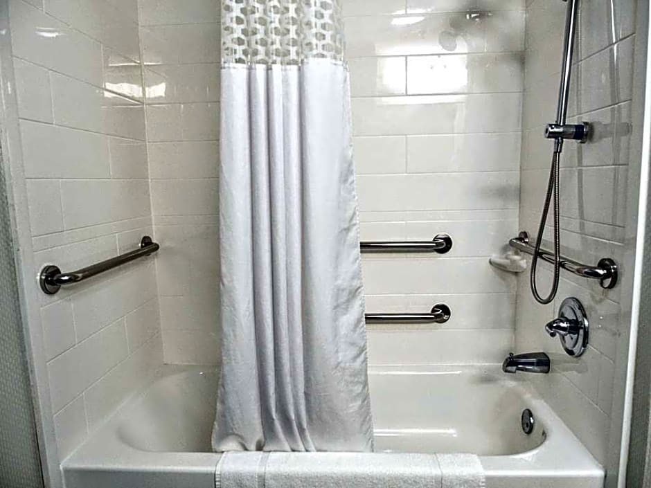 This mobility and hearing accessible, non-smoking room features one king-sized bed, and an accessible bath tub. The room also has a visual alarm and notification devices for the doorbell or door knock and incoming phone calls. The room features comfortable soft seating, microwave, refrigerator, a HDTV, and easy to operate alarm clock/radio. The free WiFi access will help you stay connected while on the road. If you prefer not to work at the desk, you can use the convenient lapdesk instead. You'll also enjoy the convenience of having a coffeemaker with tea service and iron/ironing board in your room. Any corresponding photo may not reflect the specific accessible room type or room feature.