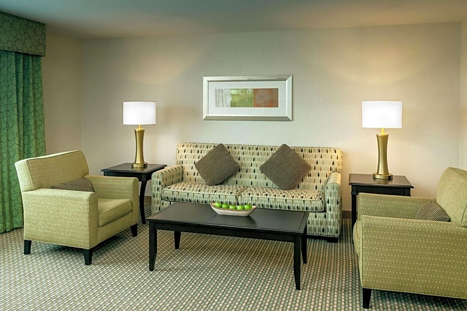This mobility and hearing accessible standard one bedroom suite features one king-sized bed, and a 3x3 transfer shower. The room also has a visual alarm, and notification devices for the doorbell or door knock and incoming telephone calls. A 3x3 transfer shower with a built-in fold down seat with grab bars, plus a showerhead that can be used as a handheld or fixed shower. Lowered vanity in bathroom, and lowered shelf in closet. The ergonomic chair is good for your back and better for work. Enjoy your favorite TV show on our 36-inch HDTV. There's also a microwave, refrigerator and coffee maker to help you feel at home. A separate living area with a full-sized sofa bed, coffee table and TV. For conducting business, our rooms offer a spacious work desk, two telephones with dataport and voicemail and complimentary wired and wireless high-speed internet access. Any corresponding photo may not reflect the specific accessible room type or room feature.