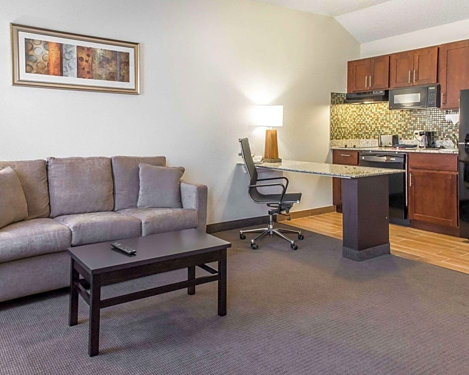 The Mainstay Suites Pittsburgh Airport offers a range of suites including those with 2 queen beds, 1 king bed, or 1 queen bed, some with a sofa bed. All rooms are non-smoking and can accommodate up to 2 adults and 1 child. The room sizes range from 355 sqft to 377 sqft, and bed sizes include queen and king beds, along with sofa beds in some suites.