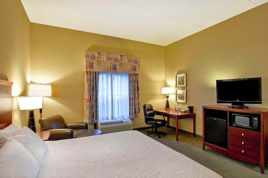 Desk and ergonomic chair, armchair with ottoman, free WiFi, refrigerator, microwave, 37-inch HDTV. Settle in to this spacious non-smoking guest room, featuring a comfortable king-sized bed. Sit back in the armchair, put your feet up on the ottoman, and find something to watch on the 37-inch HDTV. Surf the web with our free WiFi access, or use it to get some work done in comfort at the desk with an ergonomic chair. Enjoy a peaceful night's sleep in the clean and fresh Hampton bed®. Other amenities in this room include weekday newspaper delivery, a refrigerator, microwave, fluffy towels, and a coffee machine.