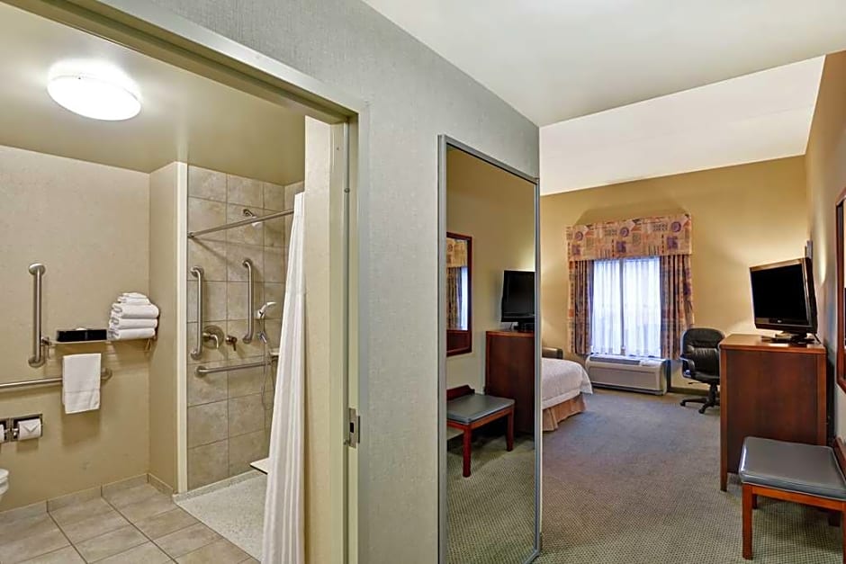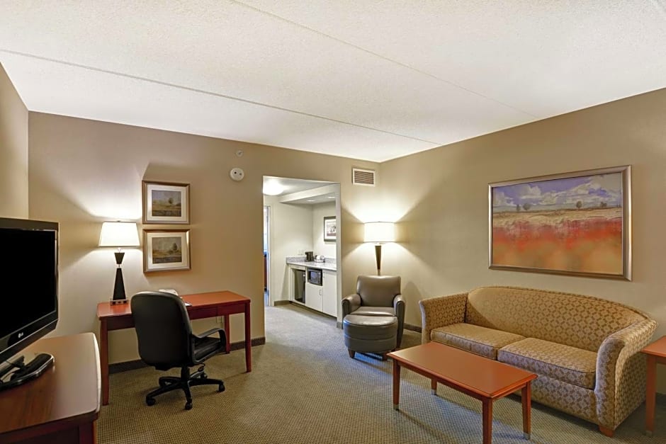 Separate living room, desk and ergonomic chair, sofa bed, free WiFi, refrigerator, microwave, 37-inch HDTV. Treat yourself to this spacious two-room suite, featuring a comfortable king-sized bed and a separate living room with sofa bed. Stretch out on the sofa and find something to watch on the 37-inch HDTV. Surf the web with our free WiFi access, or use it to get some work done in comfort at the desk with ergonomic chair. Enjoy a peaceful night's sleep in the clean and fresh Hampton bed®. Other amenities in this room include weekday newspaper delivery, a refrigerator, microwave, fluffy towels, and a coffee machine.