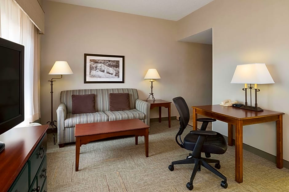 Sofa, recliner or lounge chair, free WiFi, 32-inch TV, work desk, coffeemaker, shower Unwind in this non-smoking studio suite which features a king-sized clean and fresh Hampton bed®, and a plush sofa. Sit back on the recliner or lounge chair and watch a movie on the 32-inch LCD TV, catch up on work at the large desk, or surf the web with free WiFi access. Refresh in the bathroom which has a WaterPik showerhead and curved shower rod that allows more light and space in the shower.