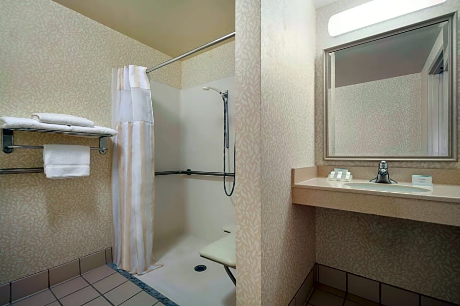 This mobility accessible standard room features one king-sized bed, and a roll-in shower. This room offers the latest in technology and ergonomic comfort to our guests. Roll-in shower with attached accessible seating, lowered vanity in bathroom, and lowered shelf in closet. The pursuit of the perfect night's stay continues with an evolution of innovative new amenities including the bed, chair, television and crisp white duvet. Enjoy your favorite television show on our 37-inch HDTV. There's also a microwave, refrigerator and coffee/tea maker to help you feel at home. For conducting business, our rooms ensure productivity thanks to the spacious work desk with the ergonomic chair, two telephones with dataport, voicemail and complimentary WiFi and wired internet access. Any corresponding photo may not reflect the specific accessible room type or room feature.