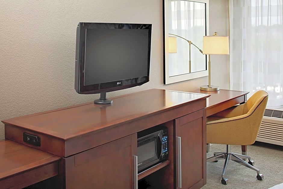 32-inch HDTV, free WiFi, work desk, coffeemaker, microwave, refrigerator and a chaise lounge chair Unwind in this welcoming and convenient room with one king-sized clean and fresh Hampton bed®. Relax on the easy chair watching the 32-inch LCD HDTV or stay on top of business at the desk. Keep up-to-date with free WiFi. This room also has a coffeemaker, microwave and refrigerator. The bathroom includes fluffy towels and a shower stall.