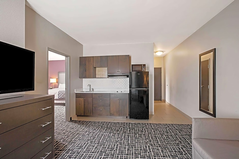 The types of rooms available at La Quinta by Wyndham York include King Rooms with Kitchenette, Executive King Studio Suites, Queen Rooms with Two Queen Beds, and Deluxe One-Bedroom King Suites. Occupancy varies, with some rooms accommodating up to 5 adults. All rooms are non-smoking and have a room size of 301 sqft. Bed sizes range from King size to Queen size.