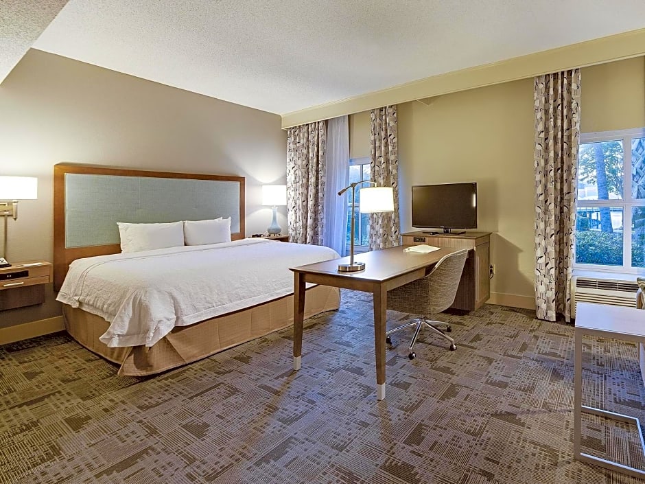 The Hampton Inn Myrtle Beach Broadway at the Beach offers a variety of room types including King Study with Sofa Bed, Queen Room with Lake View, Queen Room, King Room with Lake View, King Study with Lake View, Queen Room with Two Queen Beds, King Room with Roll-In Shower, King Room with Tub, and King Suite with Whirlpool. Smoking is not allowed in any of the rooms. The room sizes are all 301 square feet, except for the King Room with Tub which is 323 square feet. The occupancy ranges from 3 adults and 2 children to 5 adults and 4 children, depending on the room type.