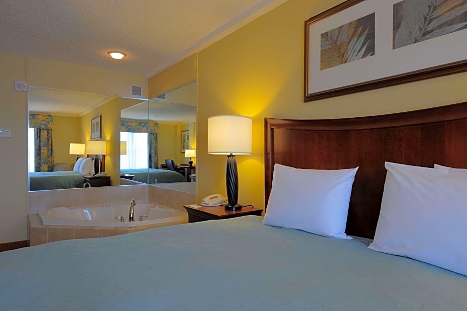 Indulge in the ultimate relaxation experience with our King Suite, complete with a luxurious whirlpool. Unwind and rejuvenate in a spacious 398 sqft suite featuring a comfortable king size bed, private bathroom, and top-notch amenities including a hot tub, microwave, and flat-screen TV. Perfect for a romantic getaway or a soothing retreat, this non-smoking suite offers a serene ambiance for 2 adults and 1 child. Book now to elevate your stay to a new level of comfort and tranquility.