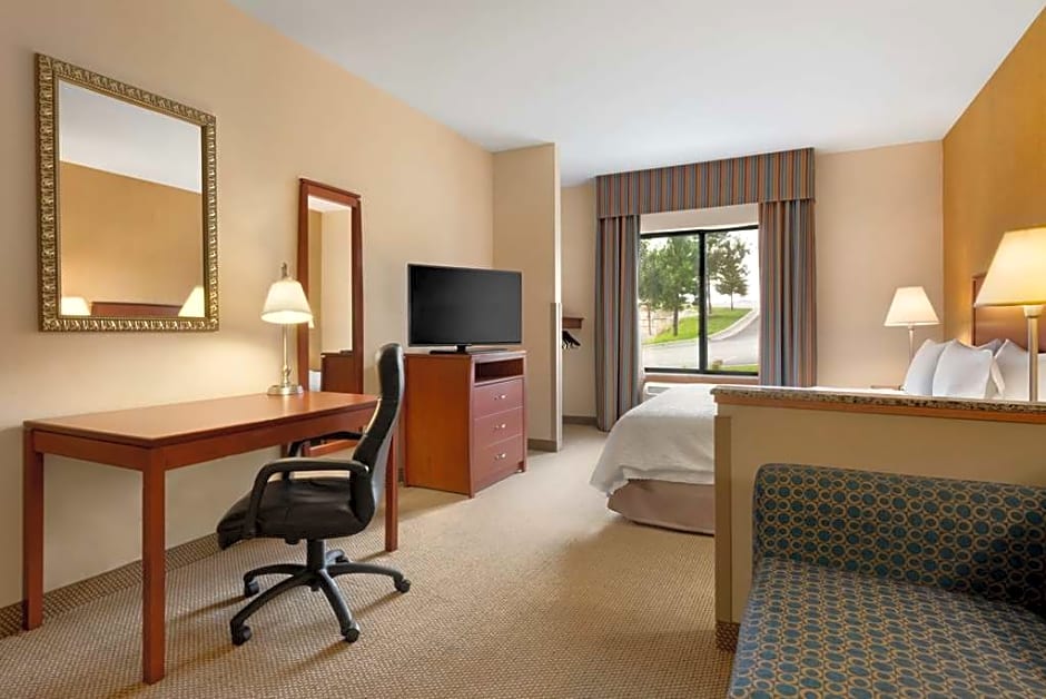 Any corresponding photo may not reflect the specific accessible room type or room feature. This hearing accessible, nonsmoking room features one king sized bed. The room also has a visual alarm and notification devices for the doorbell or door knock and incoming phone calls. The room features our luxurious clean and fresh Hampton bed, comfortable sofa bed, microwave, refrigerator, an HDTV and easy to operate alarm clock/radio. In the bath, you will enjoy a WaterPik shower head and curved shower rod. The free high-speed internet access will help you stay connected while on the road. If you prefer not to work at the desk, you can use the convenient lapdesk instead. You'll also enjoy the convenience of having a coffee maker with tea service as well as an iron/ironing board in your room.