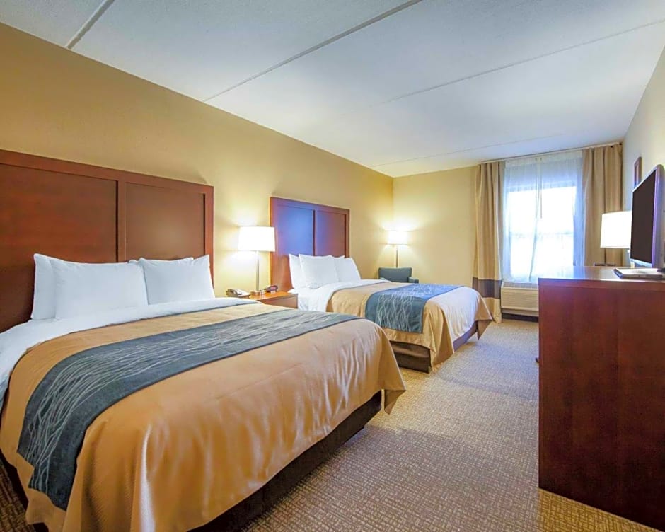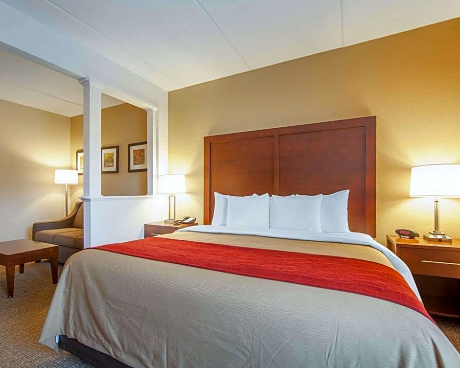 The rooms available at Comfort Inn at Royal Blue include a King Suite with a Sofa Bed, a Queen Room with Two Queen Beds, a Queen Room with Accessible Tub, and a Queen Room with a Queen Bed. Smoking is not allowed in any of the rooms. The occupancy ranges from 2 adults and 1 child to 4 adults and 3 children. Bed sizes vary depending on the room type.