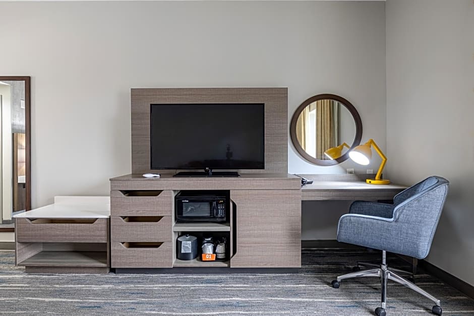 HDTV, sofa bed, work desk, coffeemaker, free WiFi access This spacious studio suite offers one king-sized clean and fresh Hampton bed®, plus a comfortable sofa bed to sleep an extra guest. Stay entertained with a variety of movies and channels on the HDTV. Business amenities include a large work desk and free WiFi access. Refresh in the bathroom with a WaterPik showerhead and fluffy towels. This room also features a handy coffeemaker to help you feel at home.