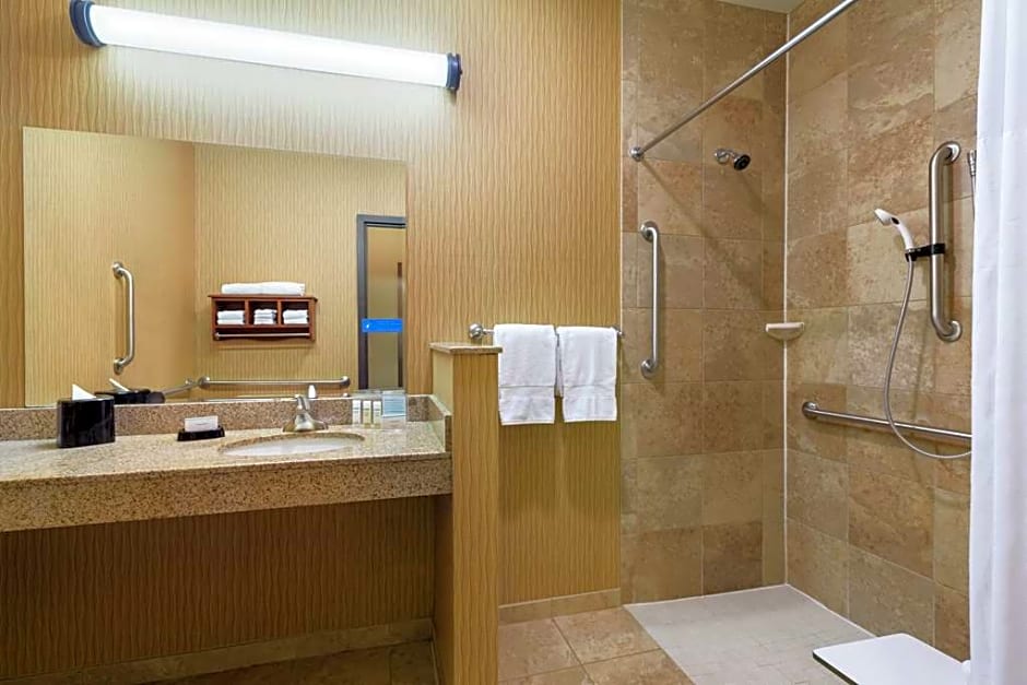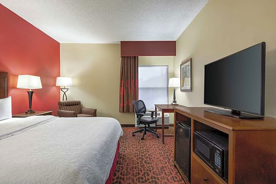 This mobility accessible, non-smoking room features one king-sized bed, and an accessible bath tub. The room features comfortable soft seating, microwave, refrigerator, a HDTV, and easy to operate alarm clock/radio. The free WiFi will help you stay connected while on the road. If you prefer not to work at the desk, you can use the convenient lapdesk instead. You'll also enjoy the convenience of having a coffeemaker with tea service and iron/ironing board in your room. Any corresponding photo may not reflect the specific accessible room type or room feature.