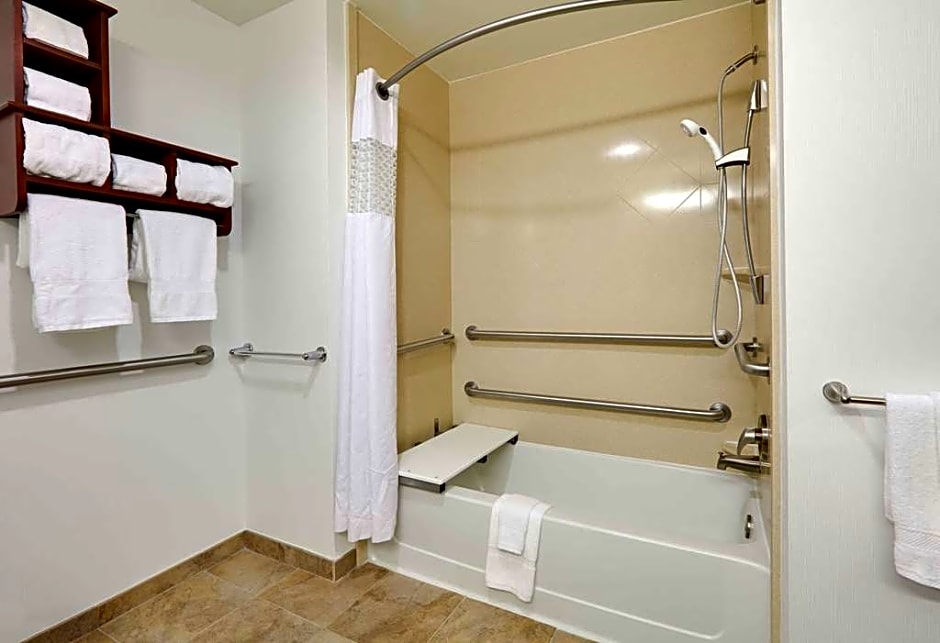 This mobility and hearing accessible, non-smoking suite features two queen-sized beds, and an accessible bath tub. The suite also has a visual alarm and notification devices for the doorbell or door knock. The room features include a microwave, refrigerator, wet bar, comfortable soft seating, a HDTV, and easy to operate alarm clock/radio. The free WiFi will help you stay connected while on the road. If you prefer not to work at the desk, you can use the convenient lapdesk instead. You'll also enjoy the convenience of having a coffeemaker with tea service and iron/ironing board in your room. Any corresponding photo may not reflect the specific accessible room type or room feature.