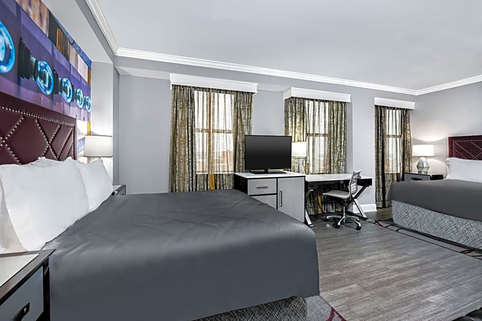 The Hotel Indigo Dallas Downtown offers a variety of room types including King Rooms, King Suites, Queen Rooms, Queen Rooms with Disability Access, Executive Queen Rooms, Standard Rooms, and Queen Suites. Smoking is not allowed in any of the rooms. The rooms accommodate between 2 to 4 adults and 1 to 3 children, with bed sizes ranging from King to Queen. Room sizes range from 248 sqft to 398 sqft.