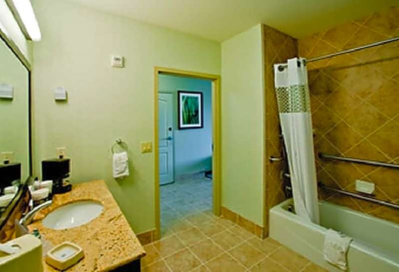 This mobility and hearing accessible, non-smoking room features one king-sized bed, and an accessible bathtub. The room also has a visual alarm and notification devices for the doorbell or door knock and incoming phone calls. The room features comfortable soft seating, an HDTV, and easy to operate alarm clock/radio. The free WiFi access will help you stay connected while on the road. If you prefer not to work at the desk, you can use the convenient lapdesk instead. You'll also enjoy the convenience of having a coffeemaker with tea service, microwave, refrigerator and iron/ironing board in your room. Any corresponding photo may not reflect the specific accessible room type or room feature.