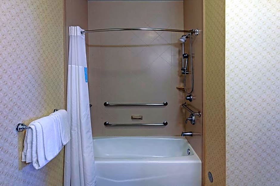 Microwave, Mini-Fridge, free WiFi, Accessible Tub Relax in this mobility and hearing accessible king room with a clean and fresh Hampton bed®. Unwind and watch TV on the 32-inch HDTV or surf the web with free WiFi. This room also features an accessible bathtub, visual alarm, notification devices for doorbell, door knocks and incoming calls. Any corresponding photo may not reflect the specific accessible room type or room feature.