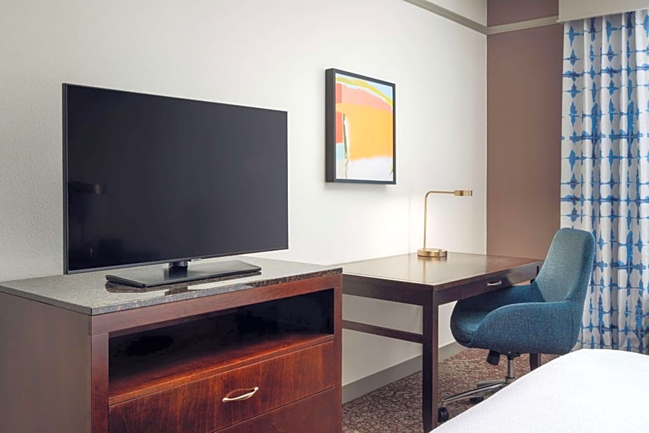 This mobility and hearing accessible standard room features one king-sized bed, and an accessible tub. The room also has a visual alarm, and notification devices for the doorbell or door knock and incoming telephone calls. Grab bar in tub with attached accessible seating, lowered vanity in bathroom, and lowered closet shelf. The ergonomic Mirra chair by Herman Miller is good for your back and better for work. Enjoy your favorite television show on our 36-inch HDTV. There's also a microwave, refrigerator and coffee/tea maker, spacious work desk, two telephones with dataport and voicemail and complimentary wired and wireless high-speed internet access. Any corresponding photo may not reflect the specific accessible room type or room feature.