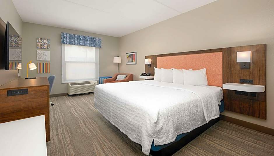 Work area, free WiFi, 37-inch LCD TV, tea/coffeemaker, easy chair with ottoman Have a relaxing stay in this king room that features a clean and fresh Hampton bed®. Unwind in the easy chair with ottoman while watching your favorite show on the 37-inch LCD TV. Enjoy a delicious hot drink from the in-room tea/coffeemaker. The room also features a microwave and mini-refrigerator. The room includes a spacious work desk and free WiFi to let you catch up on work while traveling. In the bathroom you'll enjoy fluffy towels, a WaterPik® showerhead and curved shower rod for added space and light.