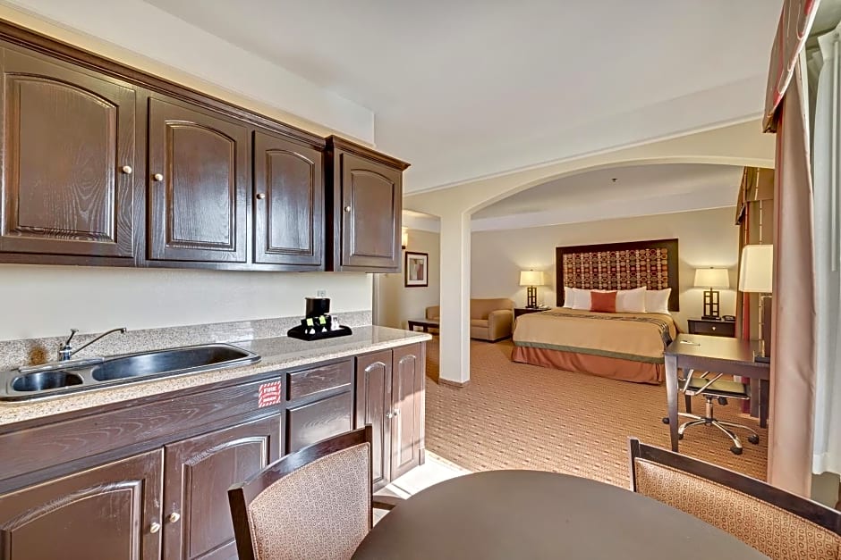 The hotel offers a variety of rooms including queen rooms with two queen beds (smoking and non-smoking), king suites (smoking and non-smoking), king rooms (smoking and non-smoking), and a family suite with four queen beds (non-smoking). The rooms can accommodate 2-4 adults and 1-3 children, depending on the room type. Bed sizes range from king to two queen beds.