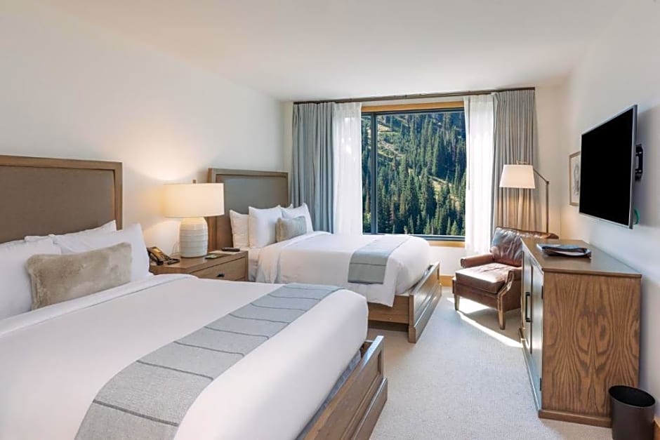 312 sq ft. This comfortable hotel room includes two double beds, a modern bathroom, leather club chair, and a reading light. The thoughtful amenities, tasteful lighting, and cozy furnishings create a home-like feel while offering views of the ski resort. Each Snowpine Lodge guest room is equipped with a 55′ flat-screen television, Chromecast, personal laptop-size safe, and complimentary high-speed wireless internet for your convenience. Bathrooms are supplied with upscale bath amenities, soft white robes, and Snowpine Lodge slippers to help you feel pampered and cozy.