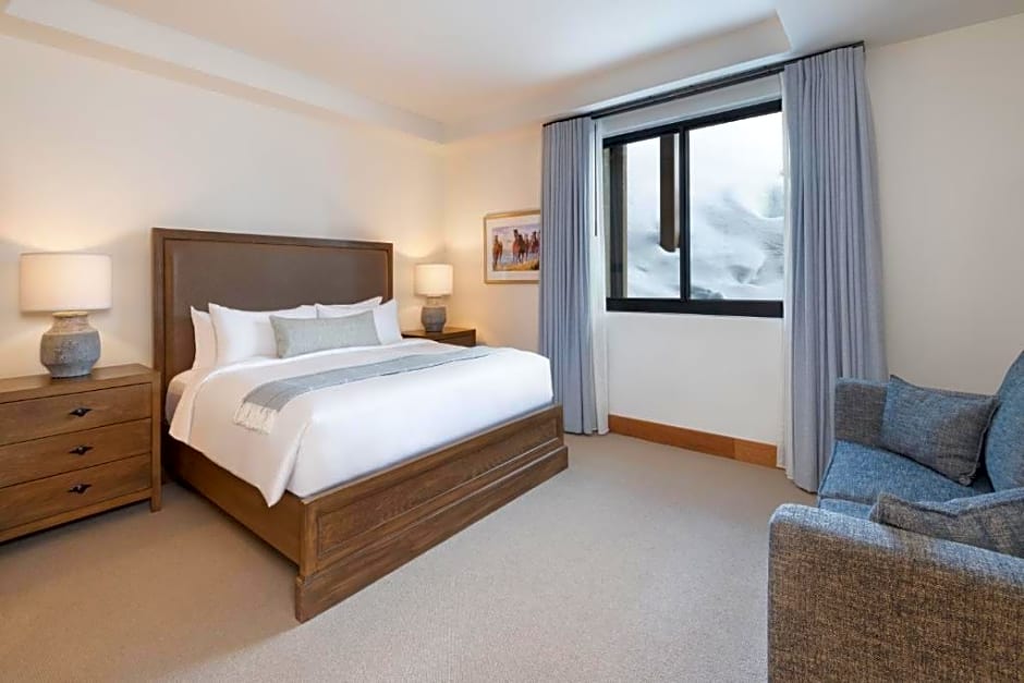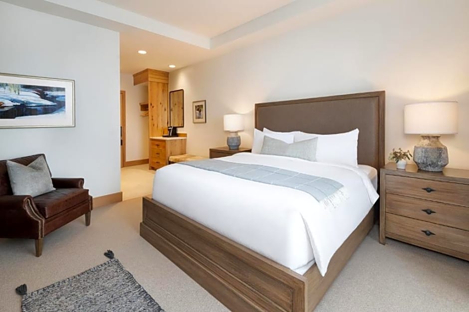 305 sq ft. The slope side king offers more space than a standard room, which makes it feel more open and luxurious. Premium amenities and comfortable furnishings make this hotel room with views of the ski resort the perfect mountain retreat. Each Snowpine Lodge guest room is equipped with a 55′ flat-screen television, Chromecast, personal laptop-size safe, and complimentary high-speed wireless internet for your convenience. Bathrooms are supplied with upscale bath amenities, soft white robes, and Snowpine Lodge slippers to help you feel pampered and cozy.
