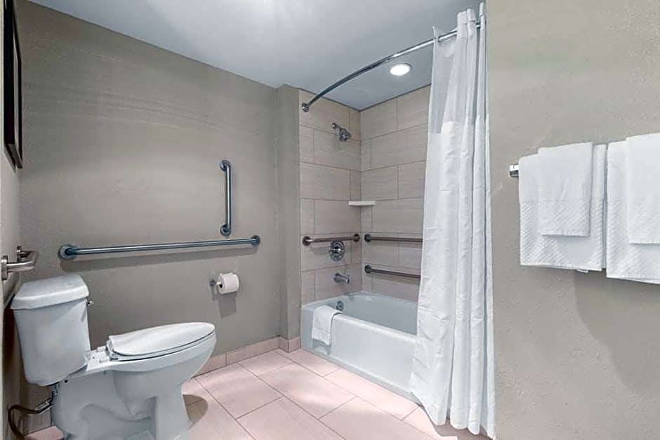This mobility and hearing accessible standard room features one queen-sized bed and a roll-in shower. The room also has a visual alarm and notification devices for the doorbell or door knock and incoming telephone calls. Free WiFi, 32-inch HDTV, alarm clock as well as hairdryer, iron, mini-refrigerator and coffeemaker. Any corresponding photo may not reflect the specific accessible room type or room feature.