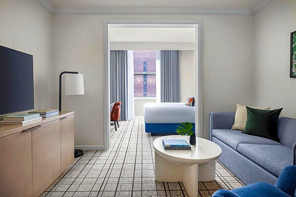 Featuring a spacious living area with a city view and a yoga mat, this spacious suite also provides Italian Frette linens, bathrobes and designer bath amenities in the private bathroom. A flat-screen TV, a desk, a JBL Bluetooth speaker and a honor bar are also featured.