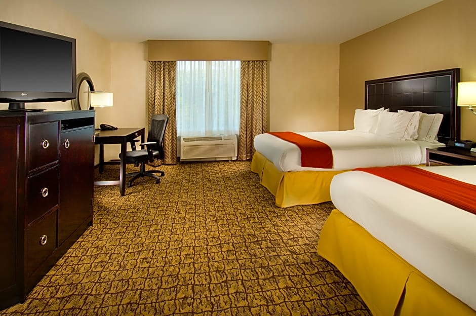 The Holiday Inn Express & Suites Alexandria - Fort Belvoir offers a variety of room types including Queen Rooms with Two Queen Beds, King Rooms, King Suites with Sofa Bed, and Queen Suites with Two Queen Beds and Sofa Bed. All rooms are non-smoking and have different occupancy capacities. The Queen Rooms and King Rooms accommodate 2 adults and 1 child, while the Suites can accommodate up to 4 adults and 3 children or 6 adults and 4 children. Bed sizes range from Queen to King, with some rooms having additional sofa beds.