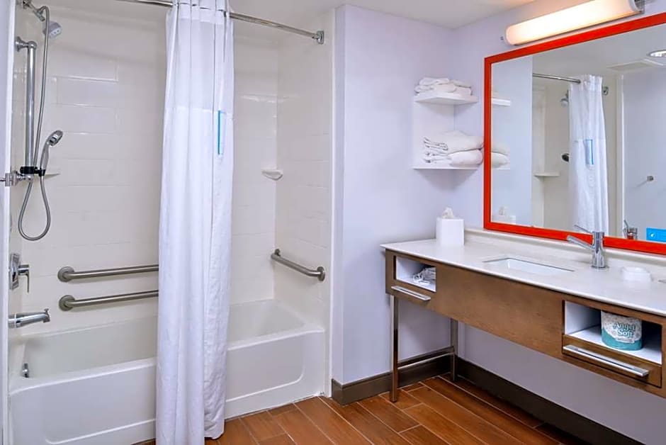 Any corresponding photo may not reflect the specific accessible room type or room feature. This mobility and hearing accessible, nonsmoking room features one king sized bed , and an accessible bath tub. The room also has a visual alarm and notification devices for the doorbell or door knock and incoming phone calls. The room features comfortable soft seating, microwave, refrigerator, a HDTV, and easy to operate alarm clock/radio. The free high speed internet access will help you stay connected while on the road. If you prefer not to work at the desk, you can use the convenient lapdesk instead. You'll also enjoy the convenience of having a coffee maker with tea service and iron/ironing board in your room.