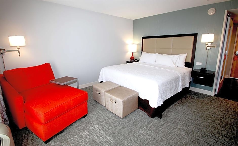 The hotel offers different types of rooms including Queen Rooms with Two Queen Beds, King Rooms, and rooms with accessibility features for those with hearing or mobility needs. All rooms are non-smoking and vary in size, with the King Room being 97 sqft. The rooms accommodate either 2 adults and 1 child or 4 adults and 3 children. The bed size options include Queen size beds or a single King size bed.