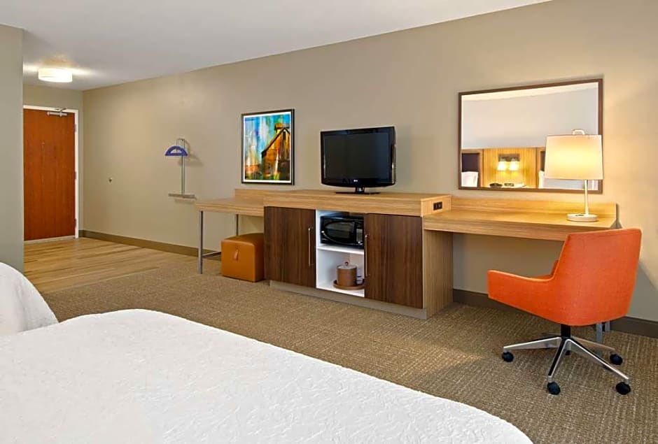This hearing accessible, non-smoking one room studio suite features one king-sized bed. The room also has a visual alarm and notification devices for the doorbell or door knock and incoming phone calls. The room features our clean and fresh Hampton bed, comfortable sofa bed, microwave, refrigerator, wet bar, a HDTV, and easy to operate alarm clock/radio. In the bath you will enjoy a WaterPik showerhead and curved shower rod. The free WiFi access will help you stay connected while on the road. If you prefer not to work at the desk, you can use the convenient lapdesk instead. You'll also enjoy the convenience of having a coffeemaker with tea service and iron/ironing board in your room. Any corresponding photo may not reflect the specific accessible room type or room feature.