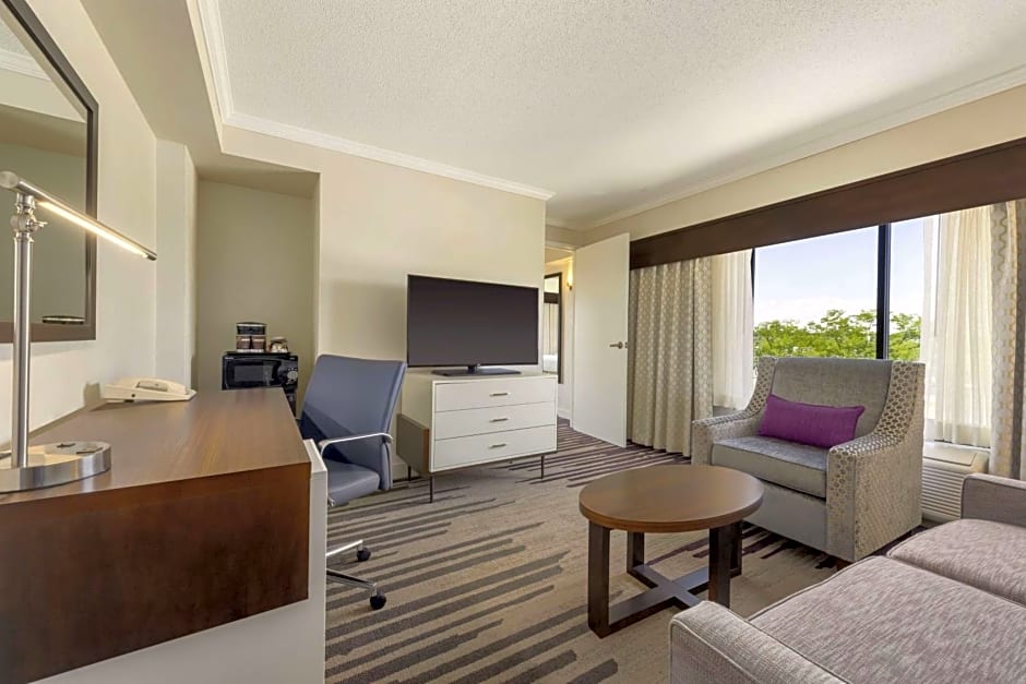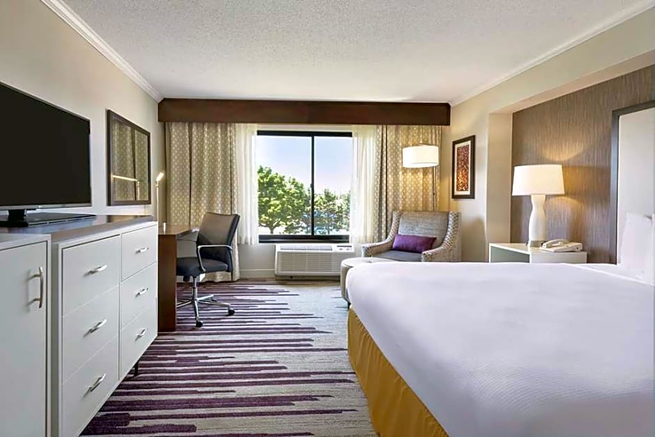 This mobility accessible standard room features one king-sized bed, and an accessible tub. The comfort of the Sweet Dreams by DoubleTree plush top king-sized bed is the centerpiece of this well-appointed non-smoking room. Lie back on the five jumbo hypo-allergenic down pillows or relax in the oversized chair with ottoman and enjoy 50+ channels on the 32-inch LCD flat-screen TV. Or if you must work, do so at the large desk with WiFi. You'll be comfortable in the adjustable ergonomic executive chair. The bathroom has enough vanity space to spread out and make yourself at home. Combed cotton terry and bath products will make you feel further pampered. Any corresponding photo may not reflect the specific accessible room type or room feature.