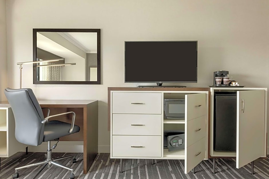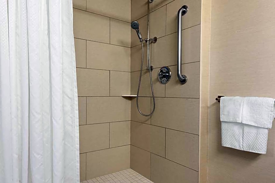 This mobility accessible standard room features one king-sized bed, and a roll-in shower. The comfort of the Sweet Dreams by DoubleTree plush top king-sized bed is the centerpiece of this well-appointed non-smoking room. Lie back on the five jumbo hypo-allergenic down pillows or relax in the oversized chair with ottoman and enjoy 50+ channels on the 32-inch LCD flat-screen TV. Or if you must work, do so at the large desk with WiFi. You'll be comfortable in the adjustable ergonomic executive chair. The bathroom has enough vanity space to spread out and make yourself at home. Combed cotton terry and bath products will make you feel further pampered. Any corresponding photo may not reflect the specific accessible room type or room feature.