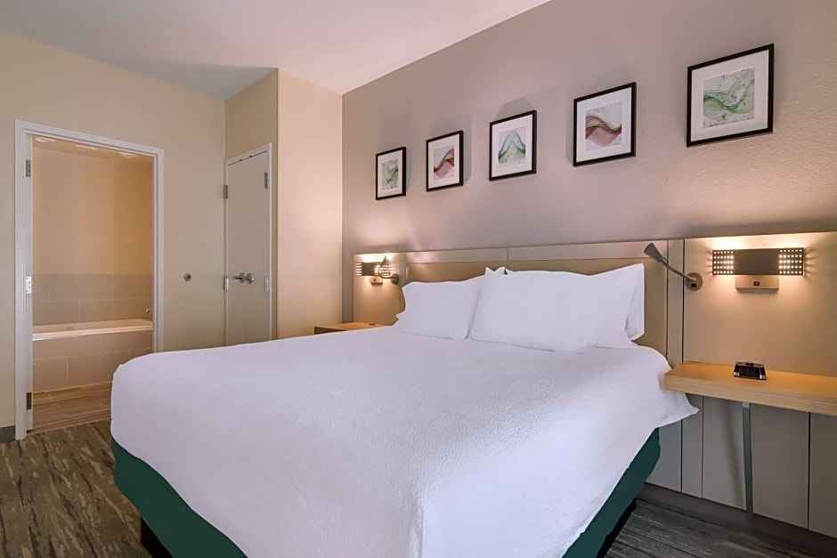 This mobility accessible whirlpool one bedroom suite features one king-sized bed, and an accessible whirlpool tub. Grab bar in tub with attached accessible seating, lowered vanity in bathroom, and lowered shelf in closet. The ergonomic chair is good for your back and better for work. Enjoy your favorite television show on our 36-inch HDTV. There's also a microwave, refrigerator and coffee/tea maker to help you feel at home. A separate living area with a full-sized sofa bed, coffee table and TV. For conducting business, our rooms ensure your productivity thanks to the spacious work desk, two telephones with dataport and voicemail. Our electrical outlets and complimentary WiFi access are all at desk-height, and task lighting allows you to get the job done. Any corresponding photo may not reflect the specific accessible room type or room feature.